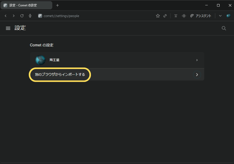 ステップ1で開いた「Cometの設定」画面から「他のブラウザからインポートする」をクリックしてください。