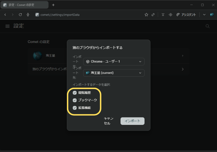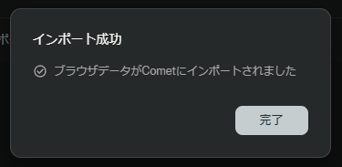 これで、これまであなたが大切にためてきたブックマークや、ログインで必要なパスワードなどがCometに自動で移行されます。